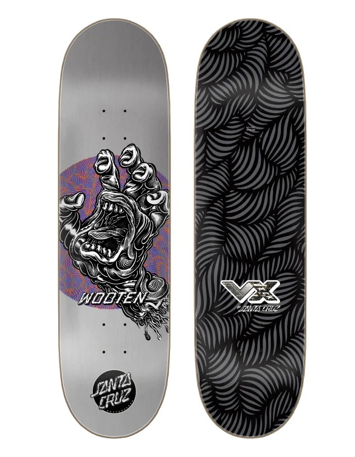 Santa Cruz Skateboards Jake Wooten Alive Hand Pro VX deck featuring art by @markdeanveca (based on the original art by Jim Phillips) with spot glass finish graphic. VX decks are thinner, stronger, and have more pop than standard 7 ply decks featuring 5 plies of North American Maple and 2 layers of Quad X technology.