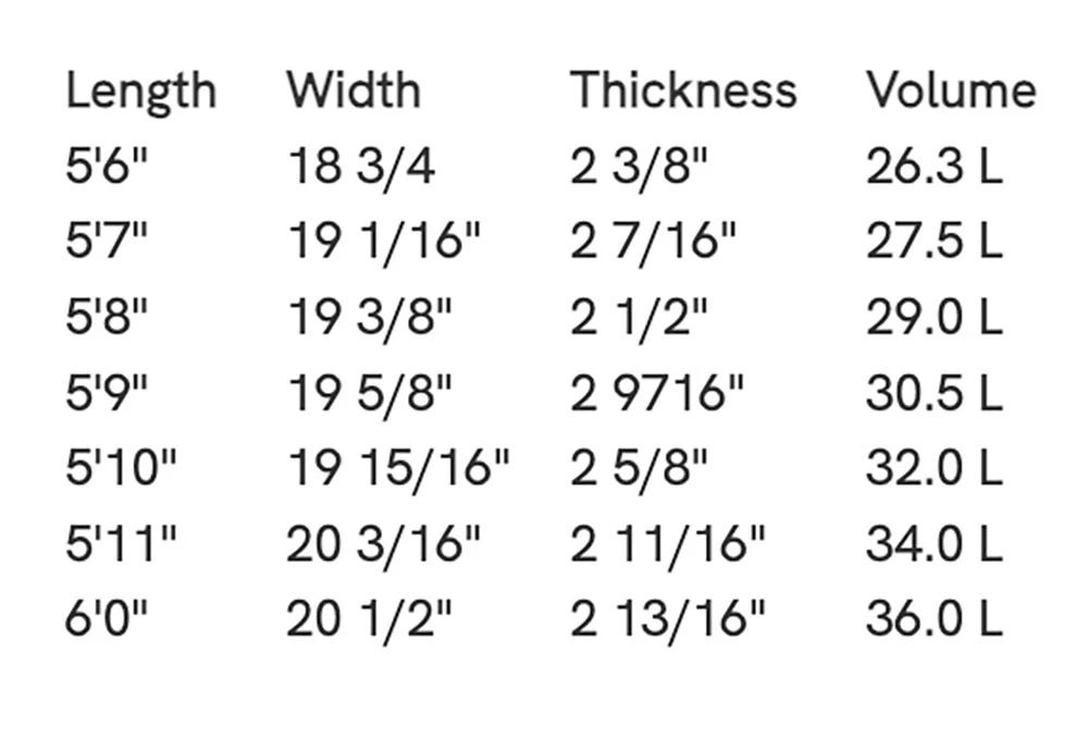| 5’8″ | 19 3/8″ | 2 1/2″ | 29.0 L |